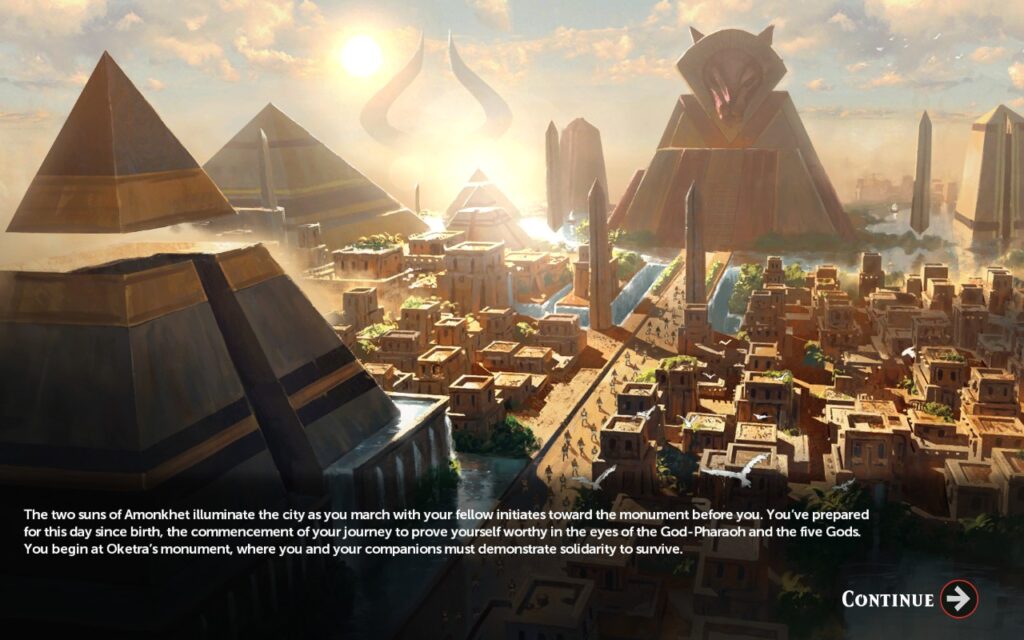 The two suns of Amonkhet illuminate the city as you march with your fellow initiates toward the monument before you. You’ve prepared for this day since birth, the commencement of your journey to prove yourself worthy in the eyes of the God-Pharaoh and the five Gods. You begin at Oketra’s monument, where you and your companions must demonstrate solidarity to survive.