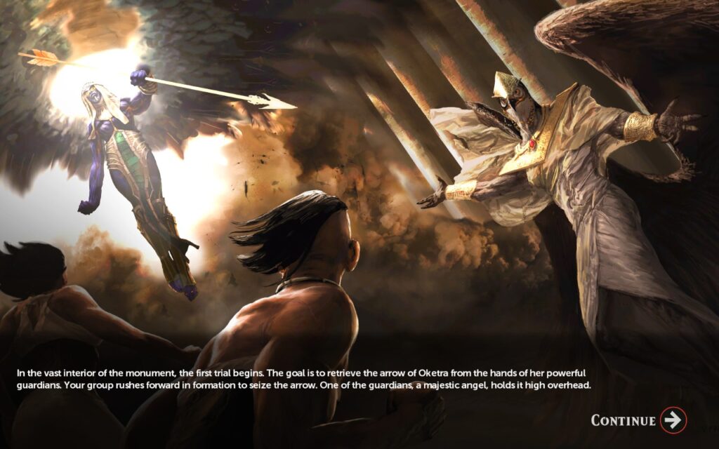 In the vast interior of the monument, the first trial begins. The goal is to retrieve the arrow of Oketra from the hands of her powerful guardians. Your group rushes forward in formation to seize the arrow. One of the guardians, a majestic angel, holds it high overhead.
