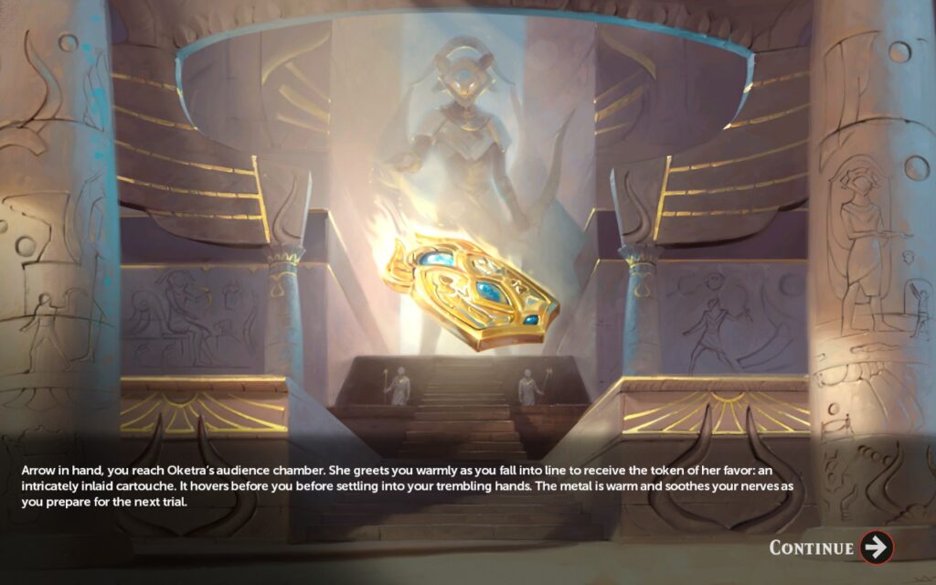 Arrow in hand, you reach Oketra’s audience chamber. She greets you warmly as you fall into line to receive the token of her favor: an intricately inlaid cartouche. It hovers before settling into your trembling hands. The metal is warm and soothes your nerves as you prepare for the next trial.