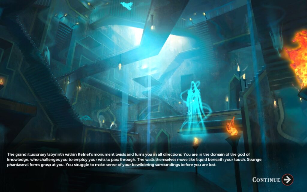 The grand illusionary labyrinth within Kefnet’s monument twists and turns you in all directions. You are in the domain of the god of knowledge, who challenges you to employ your wits to pass through. The walls themselves move like liquid beneath your touch. Strange phantasmal forms grasp at you. You struggle to make sense of your bewildering surroundings before you are lost.