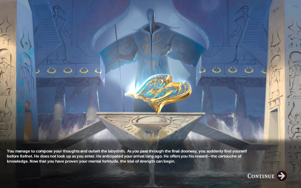 You manage to compose your thoughts and outwit the labyrinth. As you pass through the final doorway, you suddenly find yourself before Kefnet. He does not look up as you enter. He anticipated your arrival long ago. He offers you his reward—the cartouche of knowledge. Now that you have proven your mental fortitude, the trial of strength can begin.
