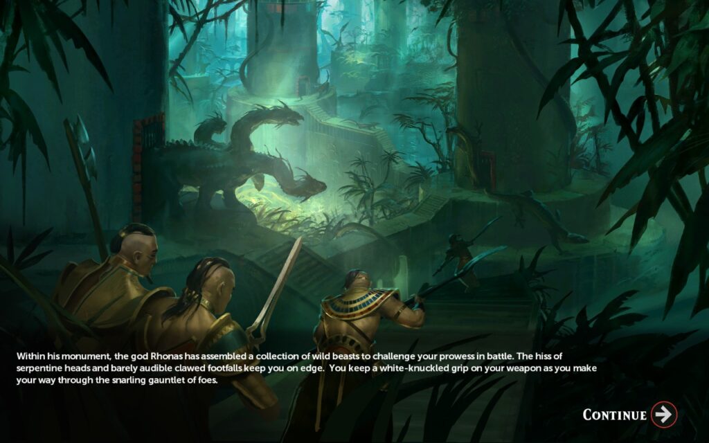 Within his monument, the god Rhonas has assembled a collection of wild beasts to challenge your prowess in battle. The hiss of serpentine heads and barely audible clawed footfalls keep you on edge. You keep a white-knuckled grip on your weapon as you make your way through the snarling gauntlet of foes.
