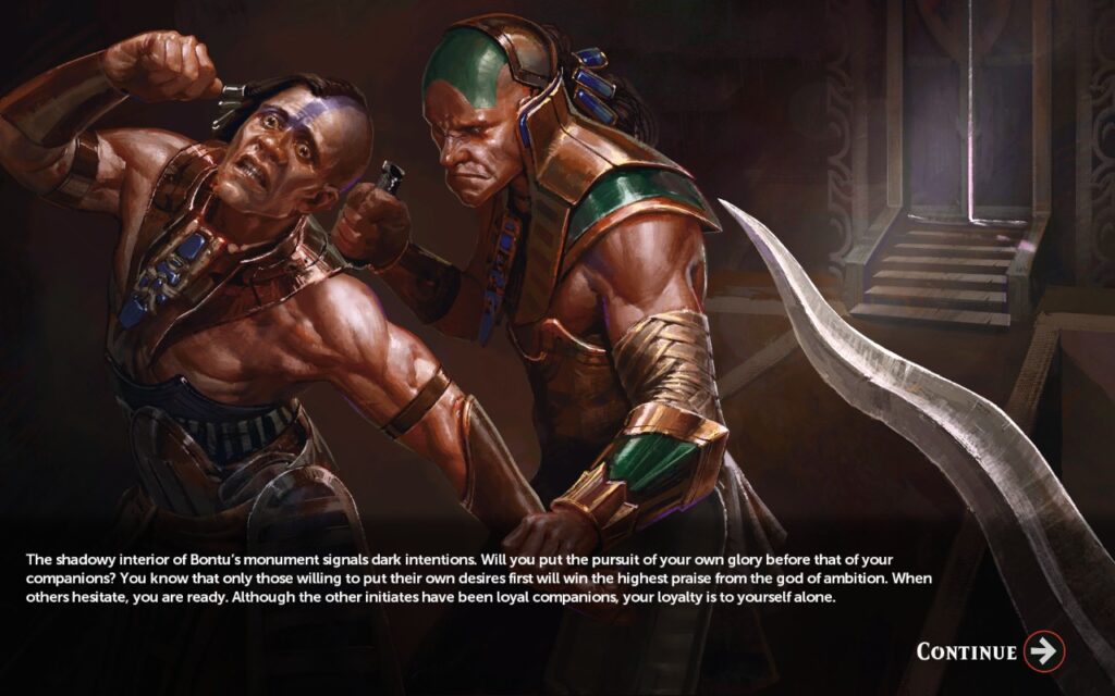 The shadowy interior of Bontu’s monument signals dark intentions. Will you put the pursuit of your own glory before that of your companions? You know that only those willing to put their own desires first will win the highest praise from the god of ambition. When other hesitate, you are ready. Although the other initiates have been loyal companions, your loyalty is to yourself alone.
