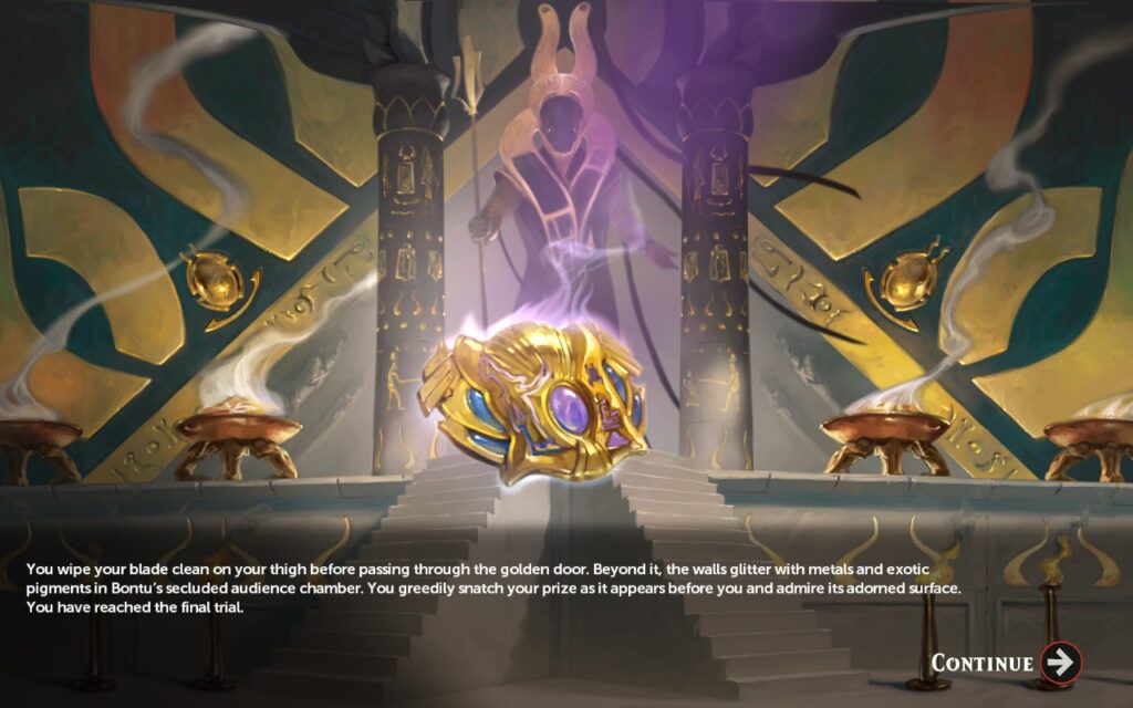You wipe your blade clean on your thigh before passing through the golden door. Beyond it, the walls glitter with metals and exotic pigments in Bontu’s secluded audience chamber. You greedily snatch your prize as it appears before you and admire it’s adorned surface. You have reached the final trial.