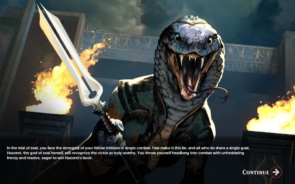 In the trial of zeal, you face the strongest of your fellow initiates in single combat. Few make it this far, and all who do share a single goal. Hazoret, the god of zeal herself, will recognize the victor as truly worthy. You throw yourself headlong into combat with unhesitating frenzy and resolve, eager to win Hazoret’s favor.