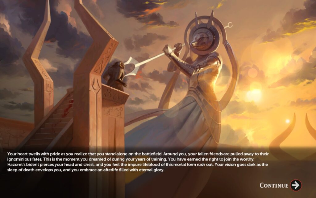 Your heart swells with pride as you realize that you stand alone on the battlefield. Around you, your fallen friends are pulled away to their ignominious fates. This is the moment you dreamed of during your years of training. You have earned the right to join the worthy. Hazoret’s bident pierces your head and chest, and you feel the impure lifeblood of this mortal form rush out. Your vision goes dark as the sleep of death envelops you, and you embrace an afterlife filled with eternal glory.